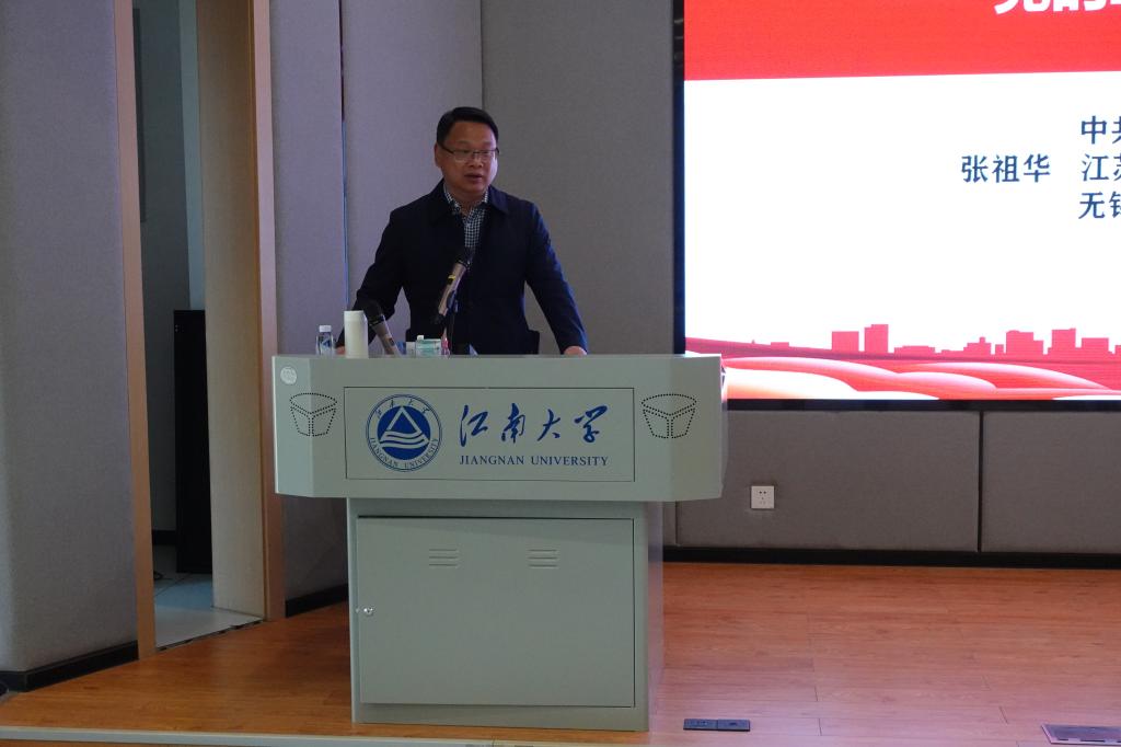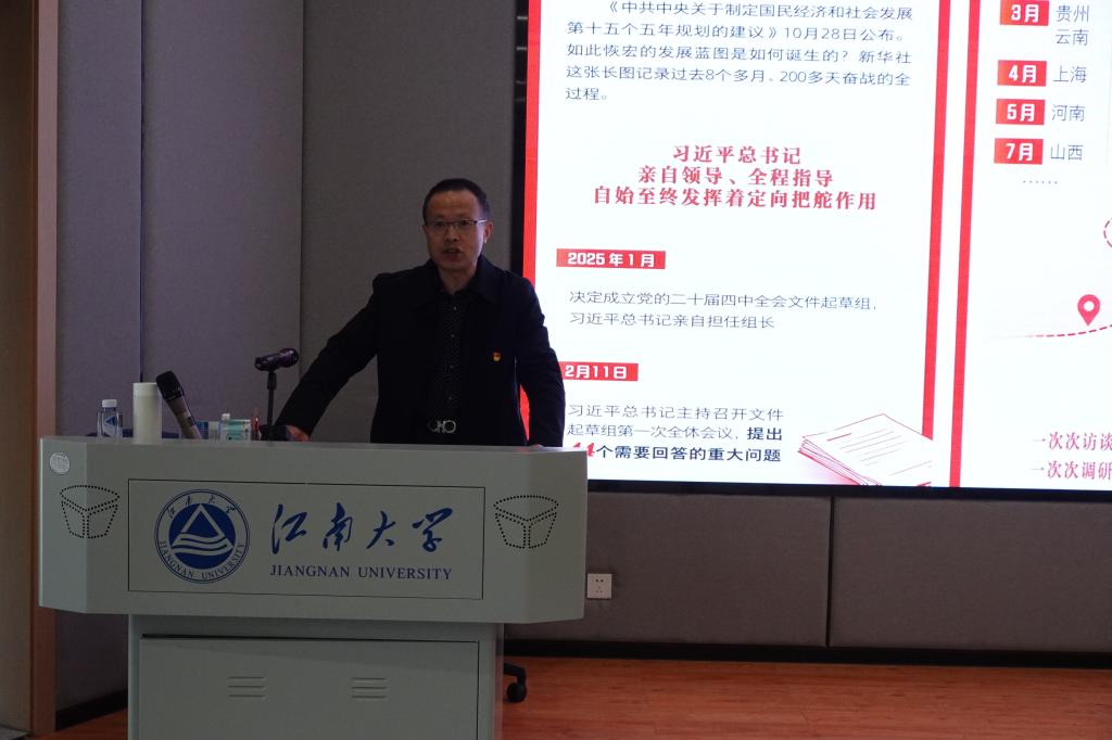 为深入学习宣传贯彻党的二十届四中全会精神,引导校区师生深刻领会、准确把握全会核心要义与精神实质,12月8日,宜兴市委宣讲团成员、无锡工艺职业技术学院马克思主义学院院长张祖华教授应邀来到江南大学宜兴校区,为师生代表作专题宣讲。宣讲会由宜兴校区管理办公室主任潘庆伟主持。